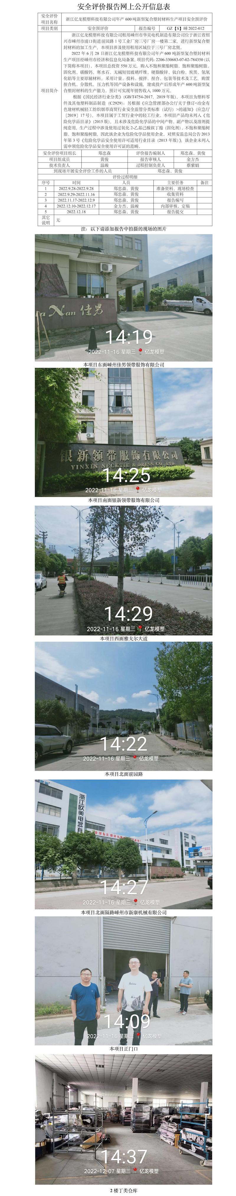 GZ【S】嵊2022-012浙江亿龙模塑科技有限公司年产600吨新型复合塑封材料生产项目安全预评价报告网上公开信息表