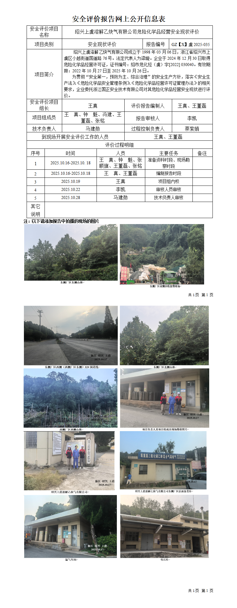 GZ【X】虞2025-035绍兴上虞溶解乙炔气有限公司危险化学品经营安全现状评价报告网上信息公开表
