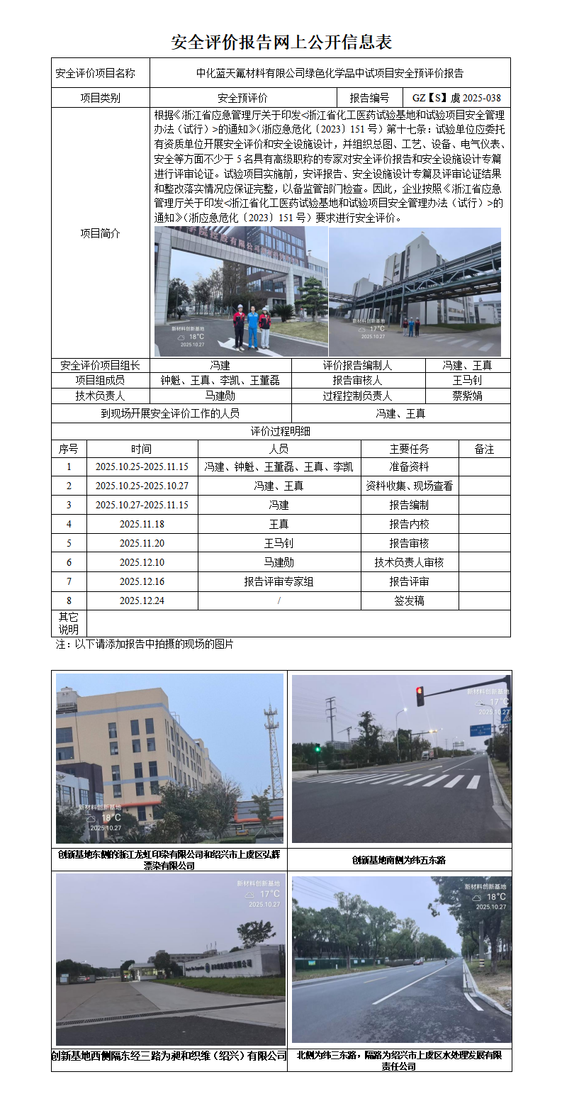 GZ【S】虞2025-038中化蓝天氟材料有限公司绿色化学品中试项目安全预评价报告网上信息公开表