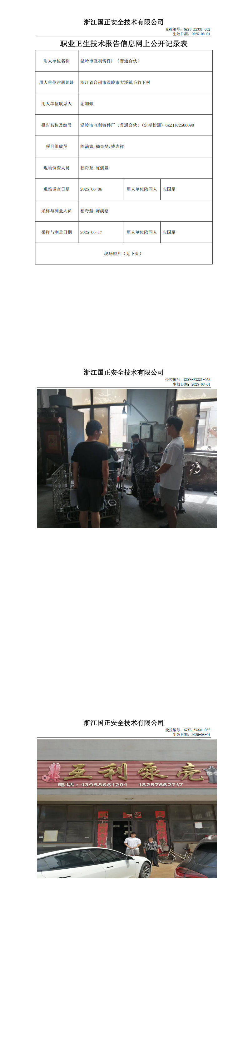 GZZJJC2506098温岭市互利铸件厂(普通合伙)工作场所职业病危害因素检测报告网上公开信息表