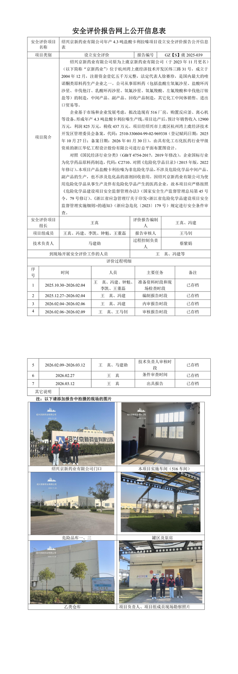 GZ【S】虞2025-039绍兴京新药业有限公司年产4.3吨盐酸卡利拉嗪项目设立安全评价报告公开信息表