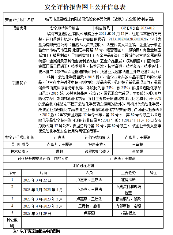 GZ【X】台2023-012临海市圣嘉铝业有限公司危险化学品使用(液氨)安全现状评价报告