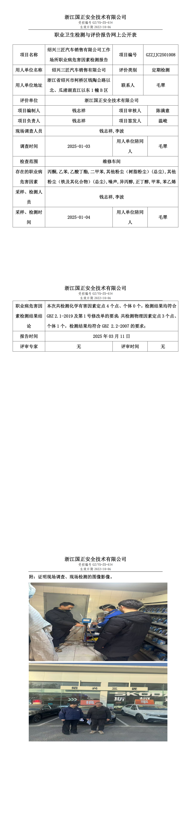 绍兴三匠汽车销售有限公司工作场所职业病危害因素检测报告网上公开信息表