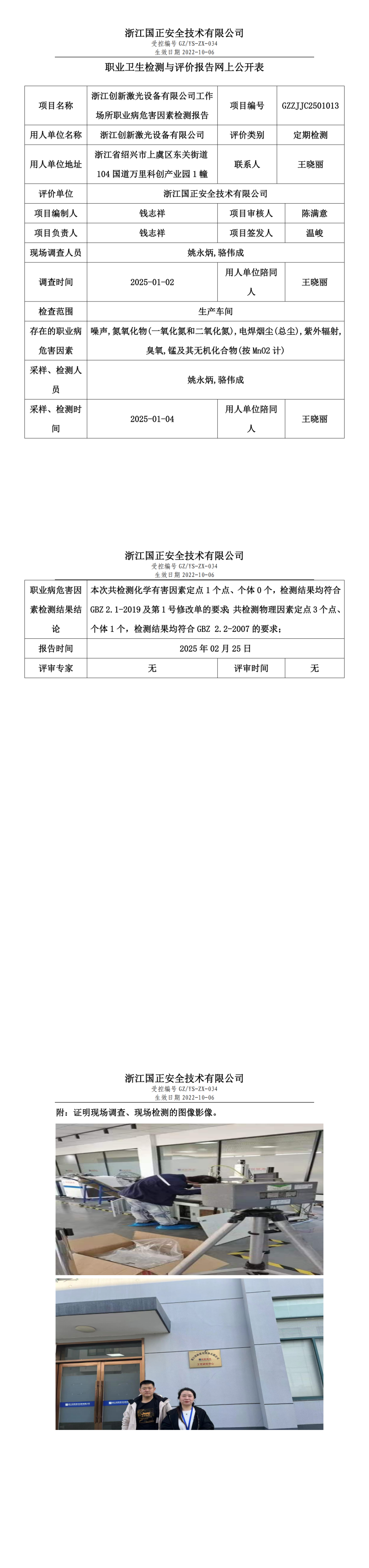 浙江创新激光设备有限公司工作场所职业病危害因素检测报告网上公开信息表