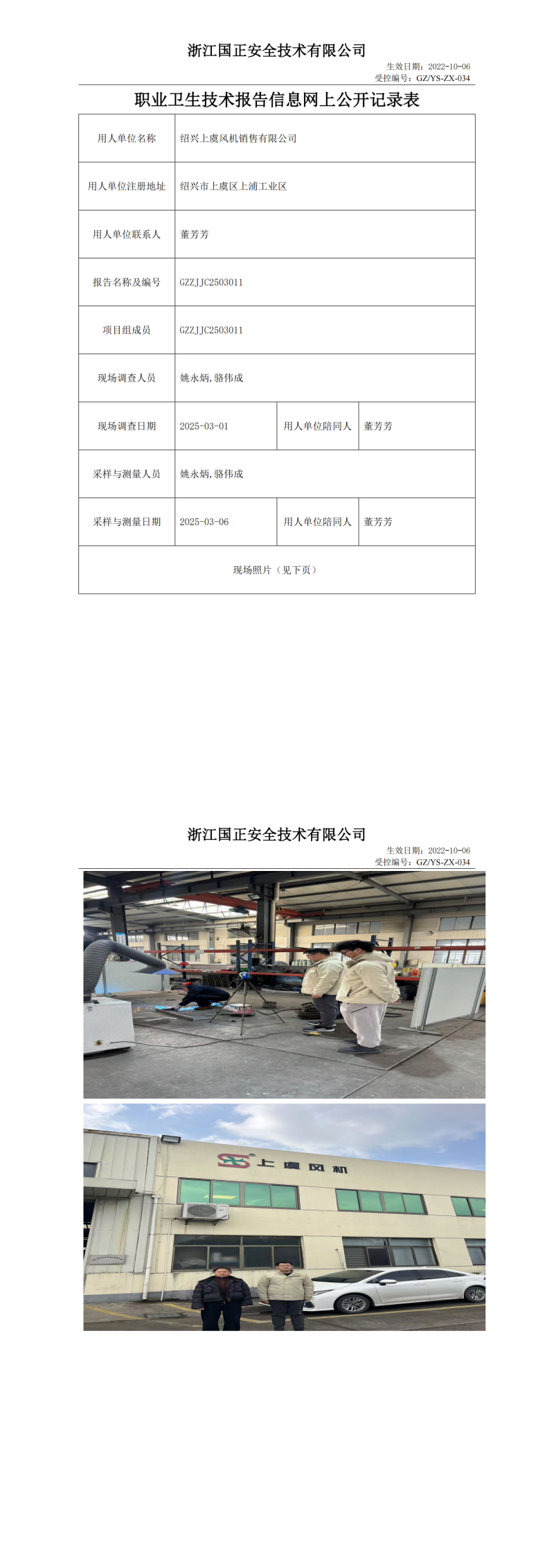 绍兴上虞风机销售有限公司工作场所职业病危害因素检测报告网上公开信息表