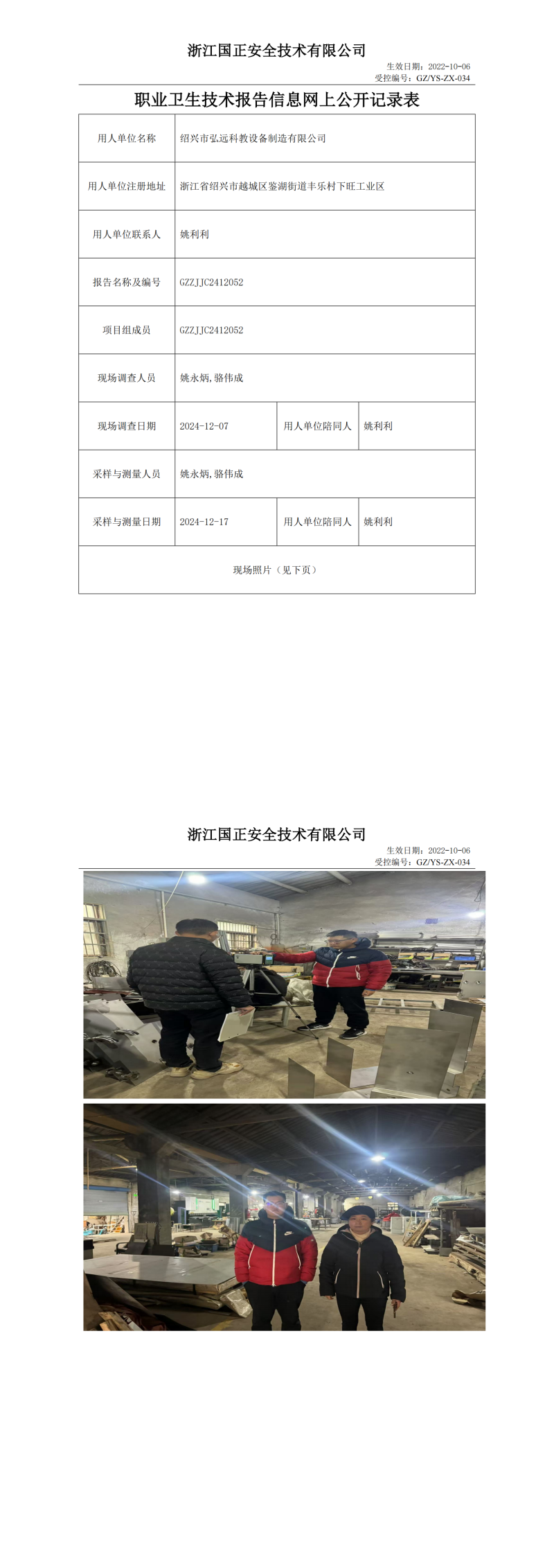 绍兴市弘远科教设备制造有限公司工作场所职业病危害因素检测报告网上公开信息表