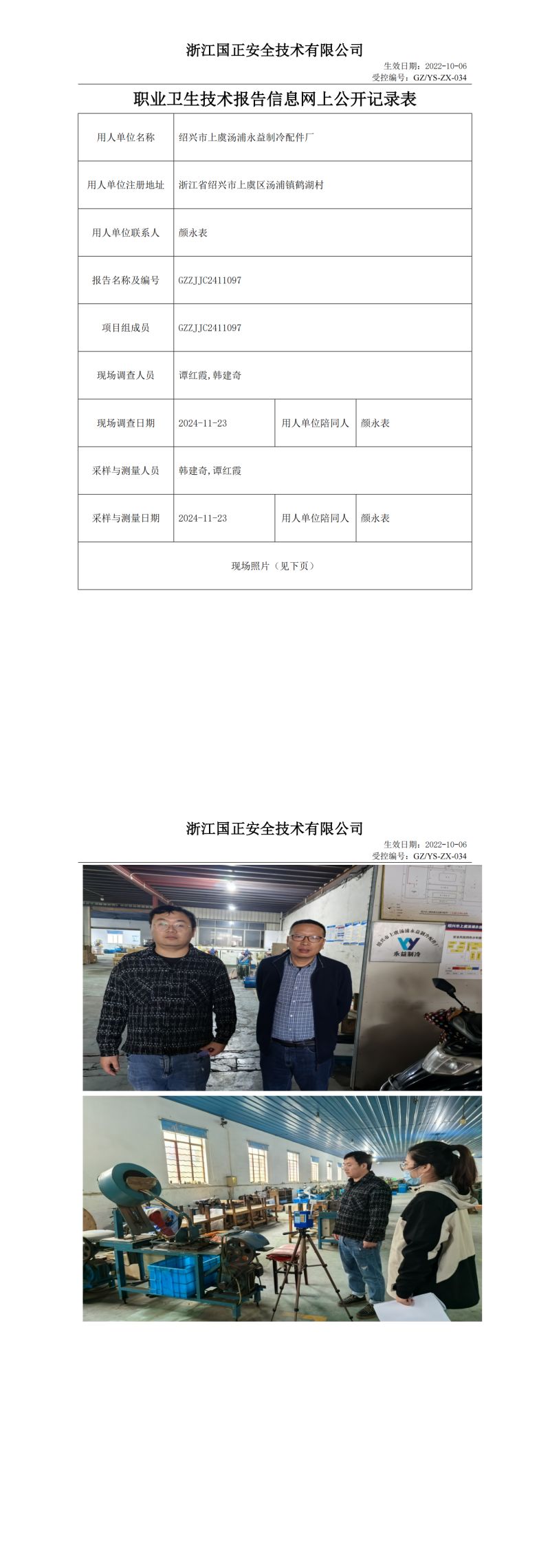 绍兴市上虞汤浦永益制冷配件厂职业卫生检测与评价报告网上公开表