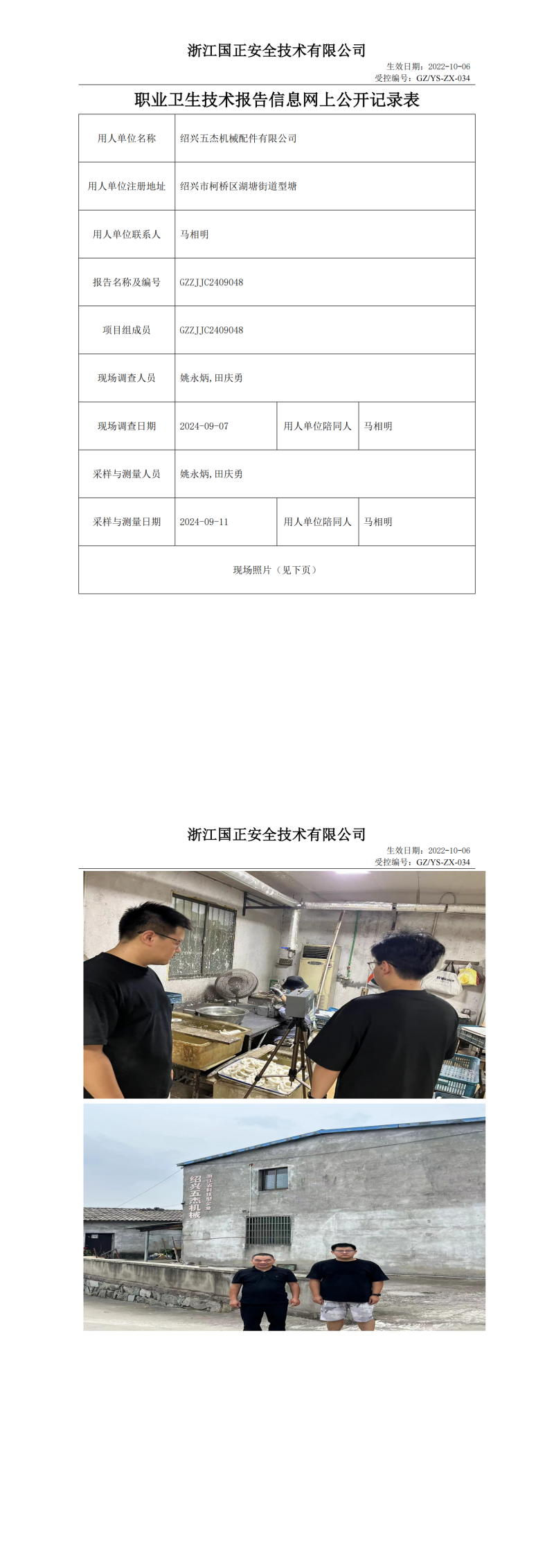 绍兴五杰机械配件有限公司工作场所职业病危害因素检测报告网上公开信息表