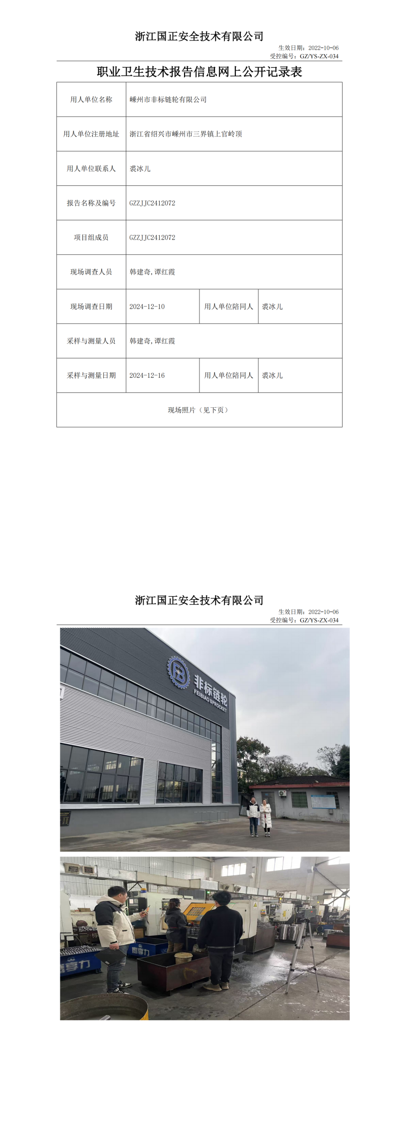嵊州市非标链轮有限公司工作场所职业病危害因素检测报告网上公开信息表