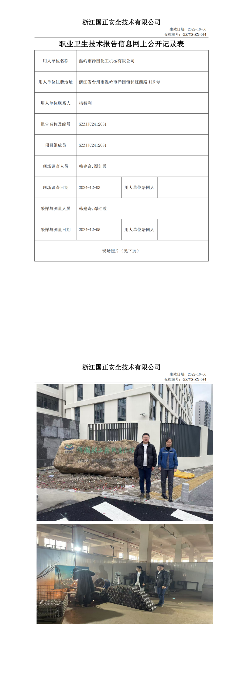 温岭市泽国化工机械有限公司工作场所职业病危害因素检测报告网上公开信息表