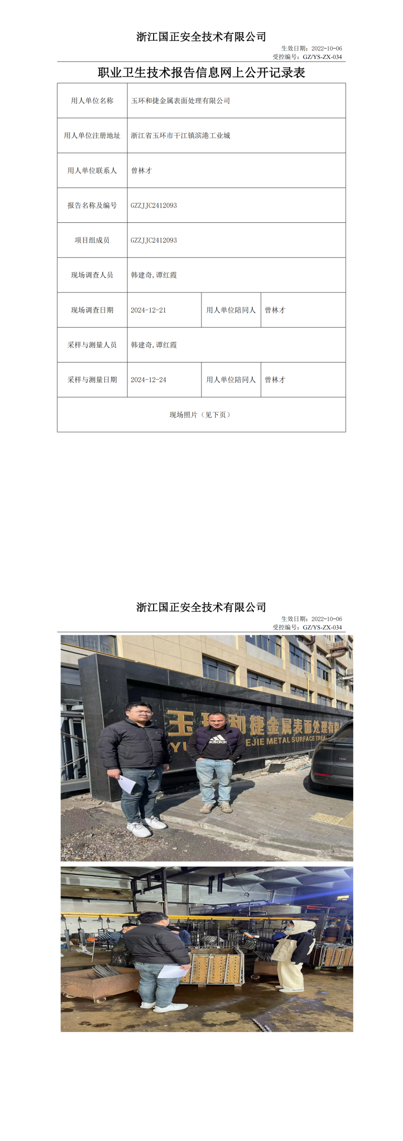 玉环和捷金属表面处理有限公司工作场所职业病危害因素检测报告网上公开信息表