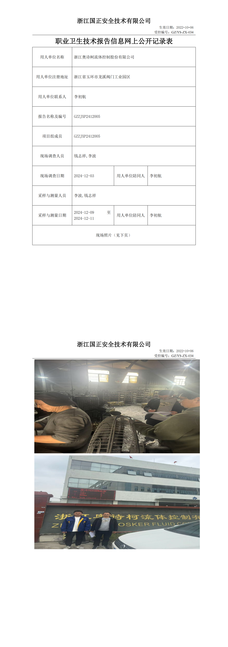 浙江奥诗柯流体控制股份有限公司工作场所职业病危害因素检测报告网上公开信息表
