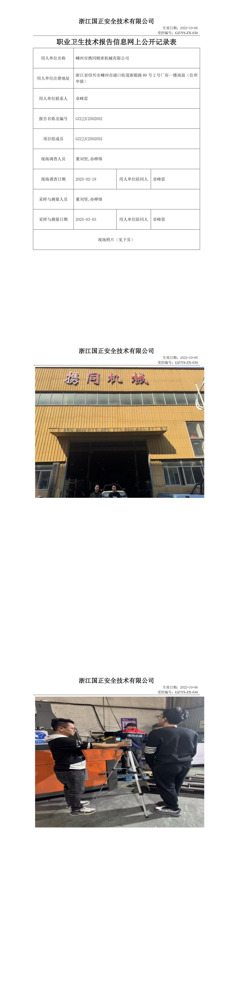 嵊州市携同精密机械有限公司工作场所职业病危害因素检测报告网上公开信息表