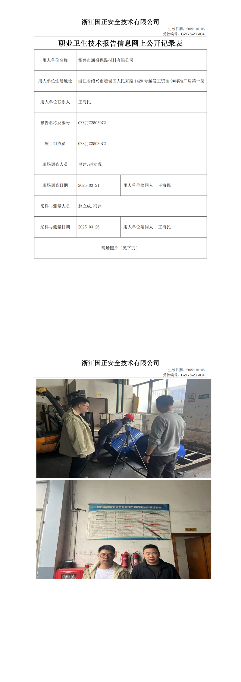 绍兴市通盛保温材料有限公司职业卫生检测与评价报告网上公开表