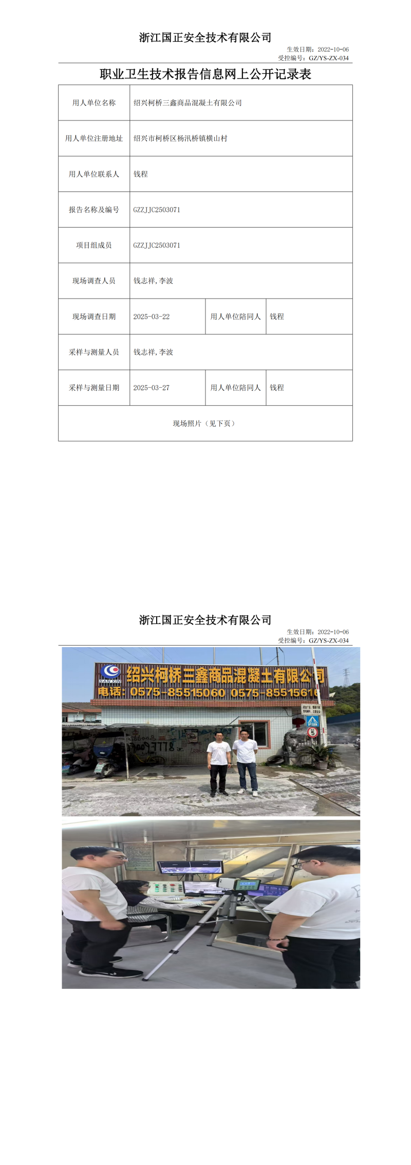 绍兴柯桥三鑫商品混凝土有限公司职业卫生检测与评价报告网上公开表