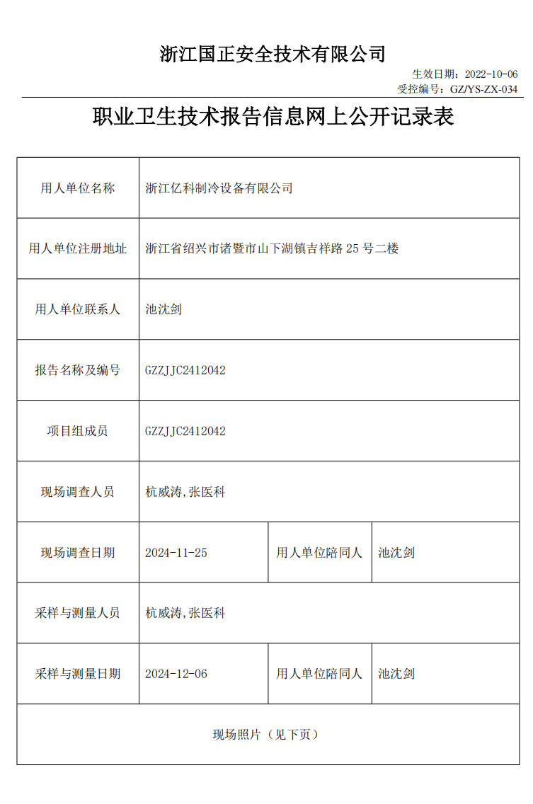 GZZJJC2412042_浙江亿科制冷设备有限公司工作场所职业病危害因素检测报告网上公开信息表