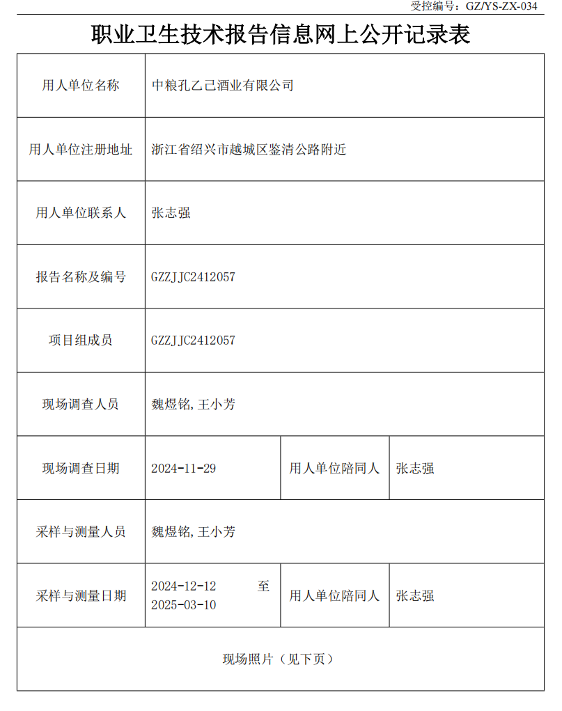 GZZJJC2412057_中粮孔乙己酒业有限公司工作场所职业病危害因素检测报告网上公开信息表