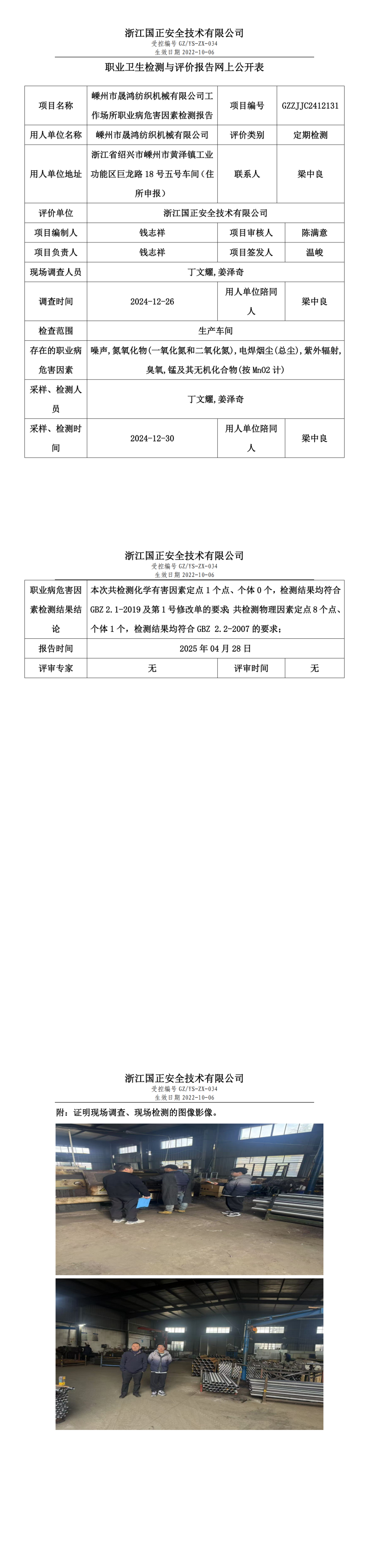 嵊州市晟鸿纺织机械有限公司工作场所职业病危害因素检测报告网上公开信息表