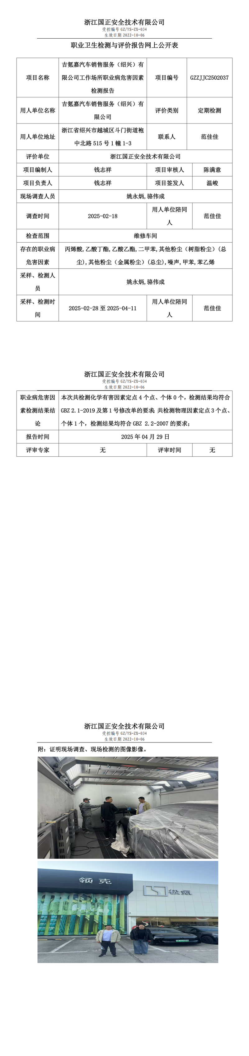 吉氪嘉汽车销售服务(绍兴)有限公司工作场所职业病危害因素检测报告网上公开信息表