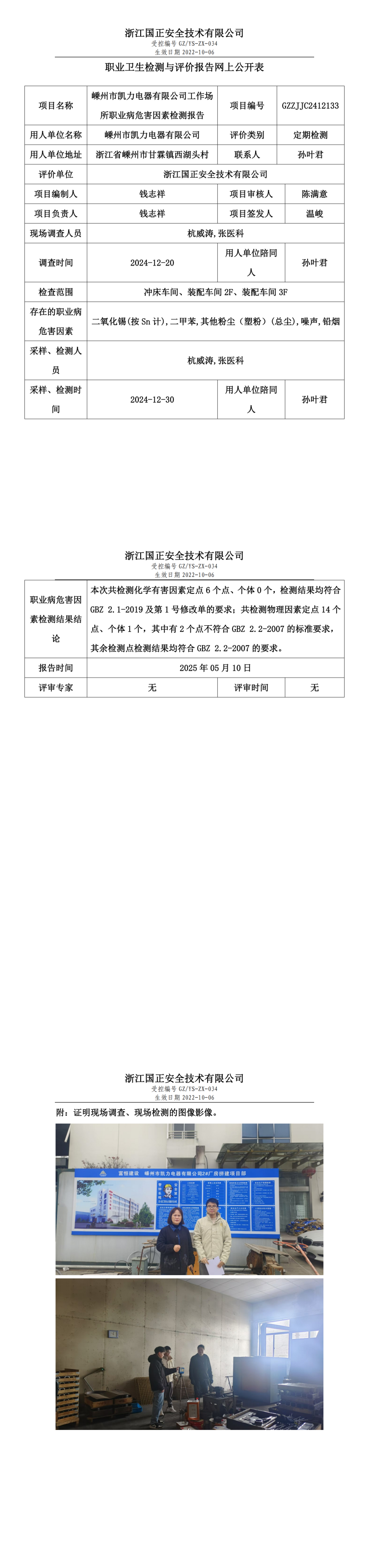 嵊州市凯力电器有限公司工作场所职业病危害因素检测报告网上公开信息表