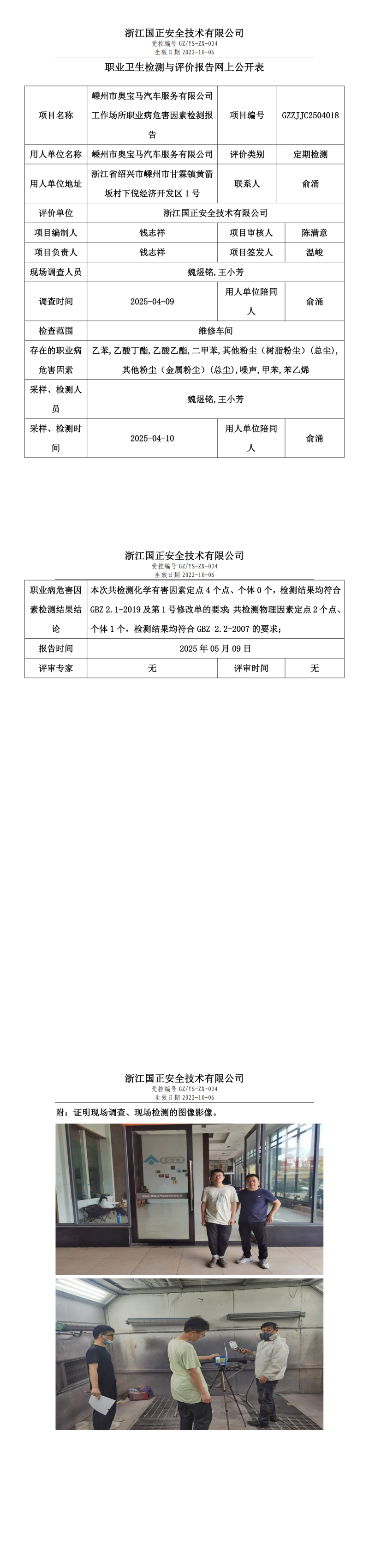 嵊州市奥宝马汽车服务有限公司工作场所职业病危害因素检测报告网上公开信息表