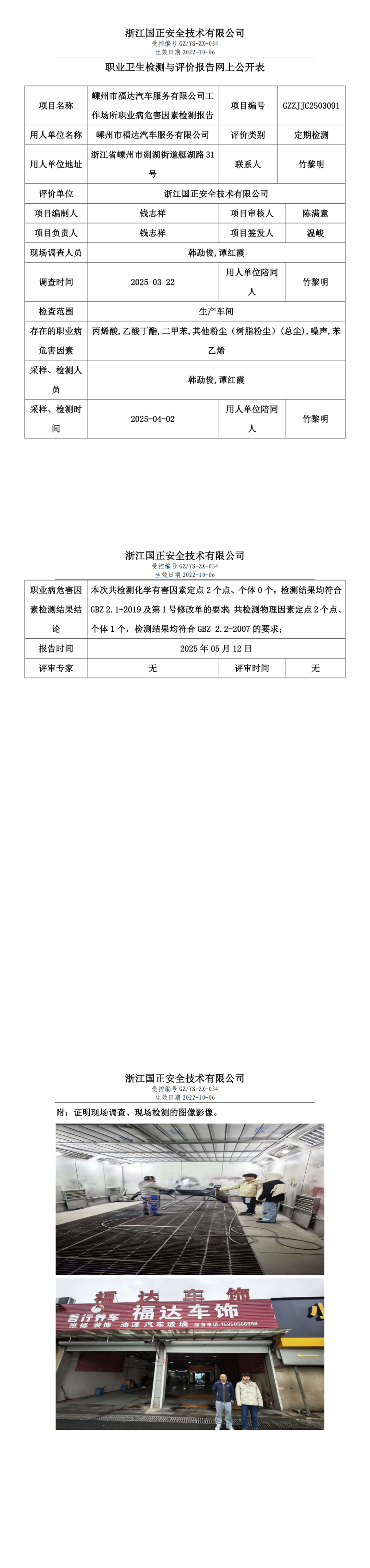 嵊州市福达汽车服务有限公司工作场所职业病危害因素检测报告网上公开信息表