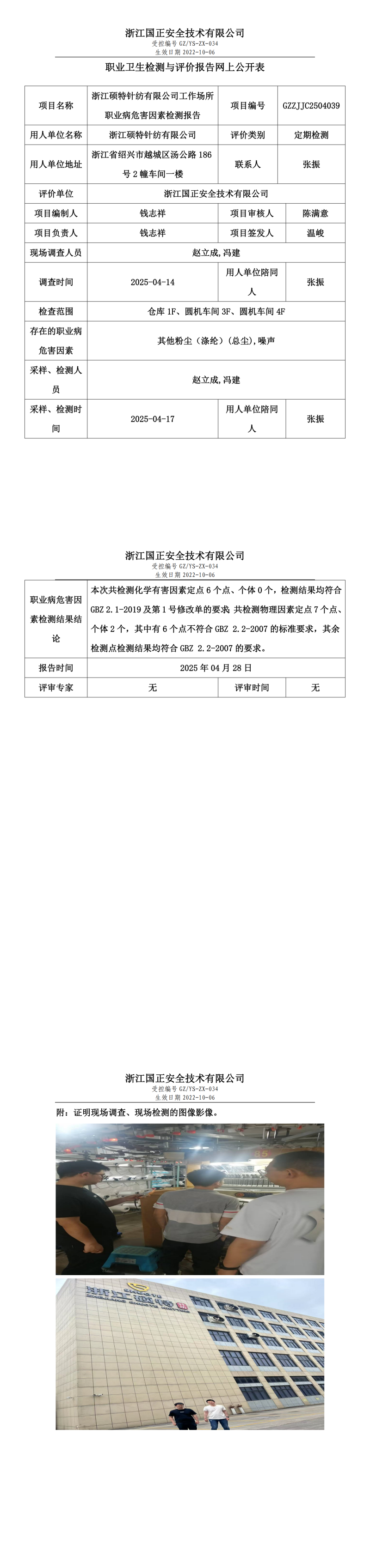 浙江硕特针纺有限公司工作场所职业病危害因素检测报告网上公开信息表