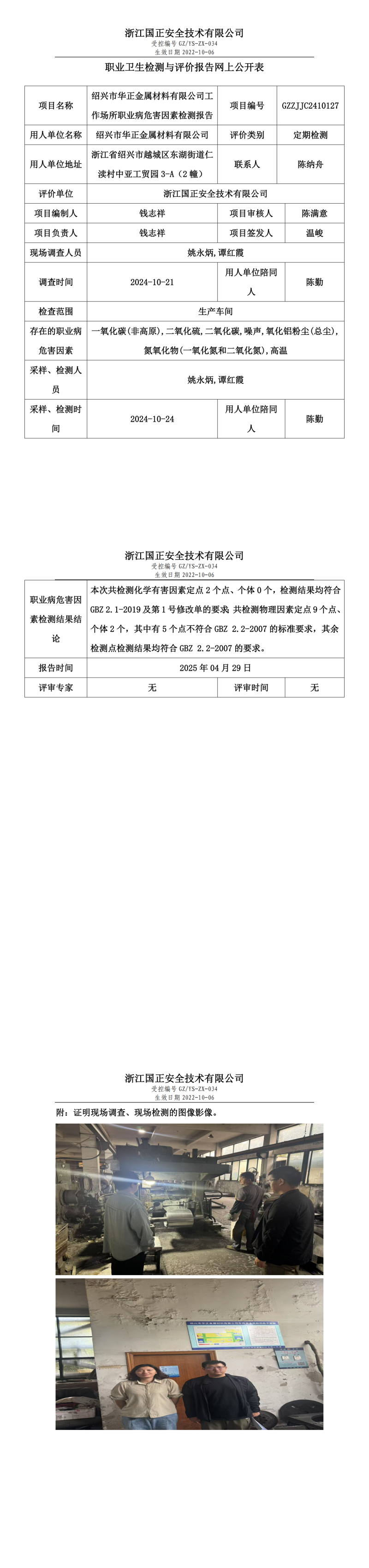 绍兴市华正金属材料有限公司工作场所职业病危害因素检测报告网上公开信息表