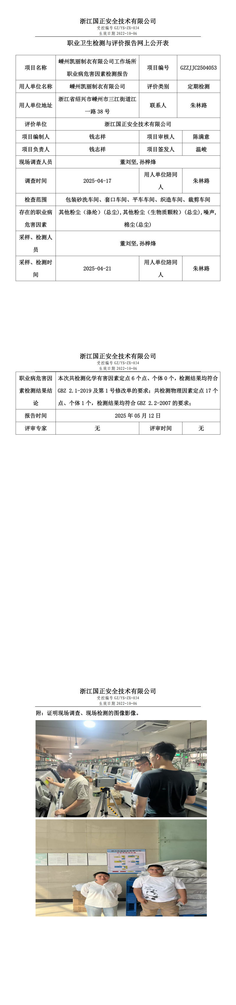 嵊州凯丽制衣有限公司工作场所职业病危害因素检测报告网上公开信息表
