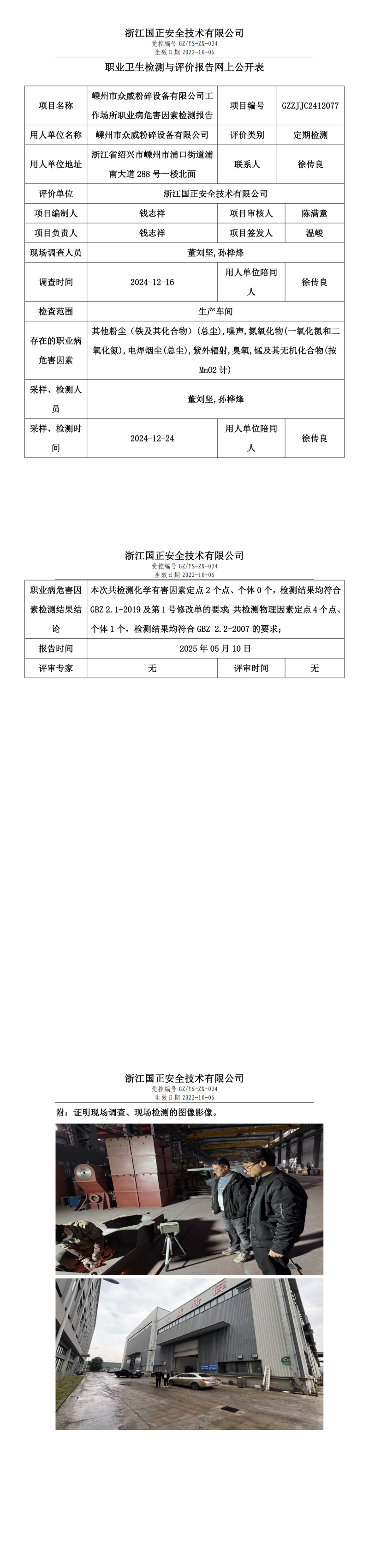 嵊州市众威粉碎设备有限公司工作场所职业病危害因素检测报告网上公开信息表