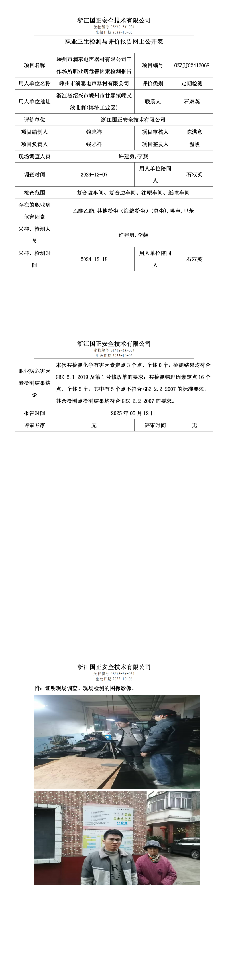 嵊州市润泰电声器材有限公司工作场所职业病危害因素检测报告网上公开信息表