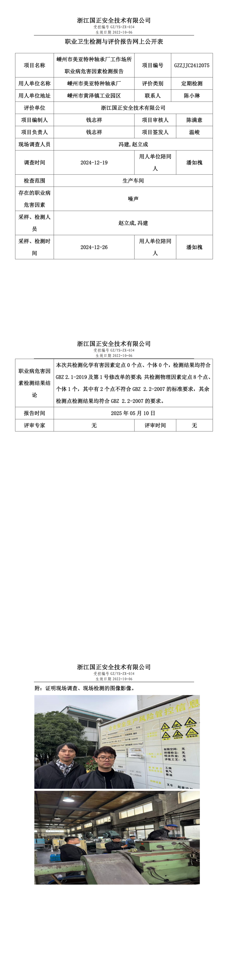 嵊州市美亚特种轴承厂工作场所职业病危害因素检测报告网上公开信息表