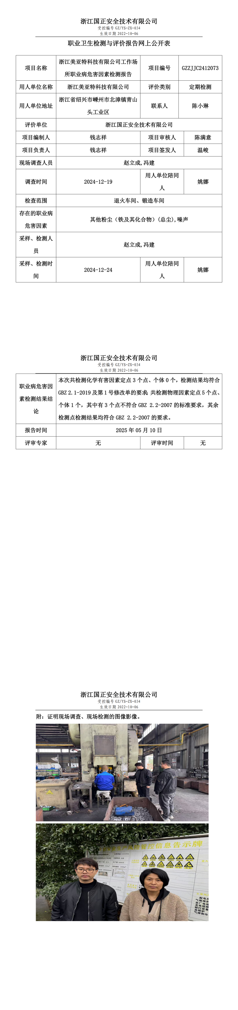 浙江美亚特科技有限公司工作场所职业病危害因素检测报告网上公开信息表