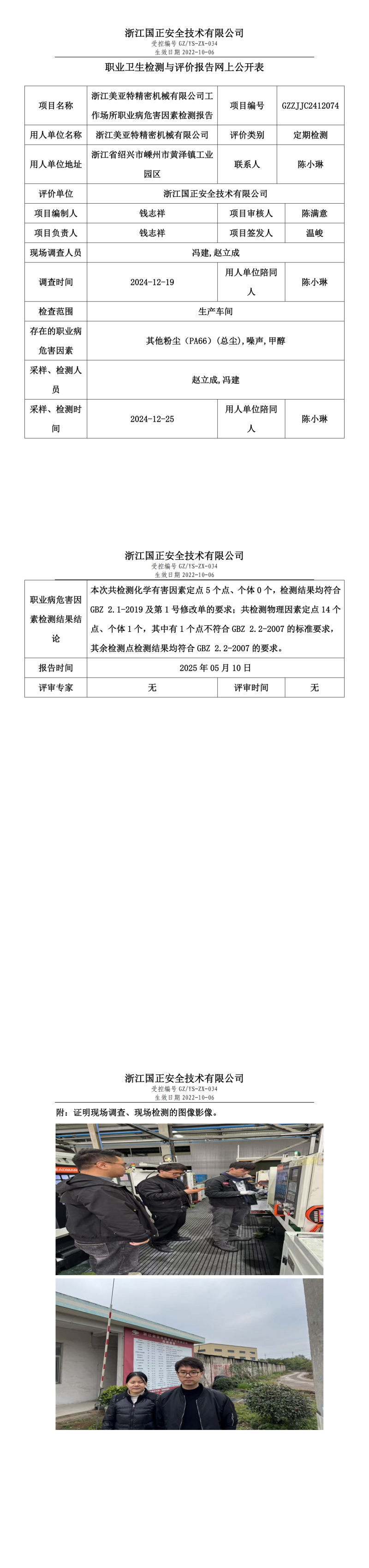 浙江美亚特精密机械有限公司工作场所职业病危害因素检测报告网上公开信息表