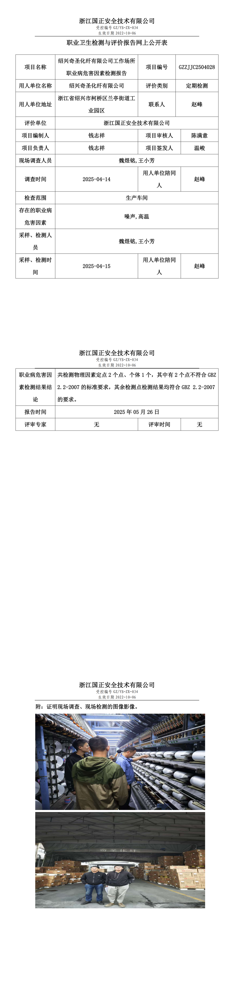 绍兴奇圣化纤有限公司职业卫生检测与评价报告网上公开表