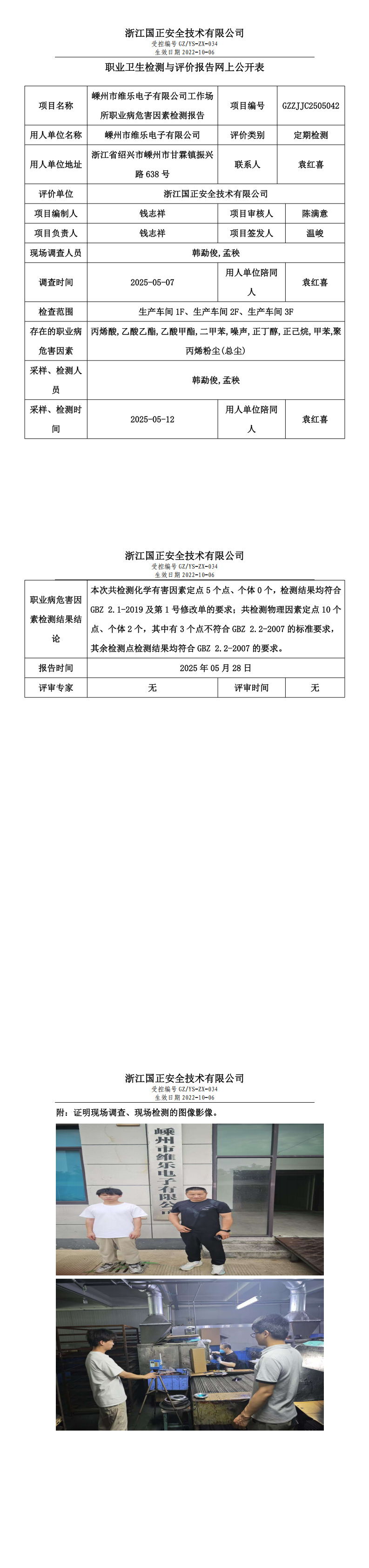 嵊州市维乐电子有限公司工作场所职业病危害因素检测报告网上公开信息表