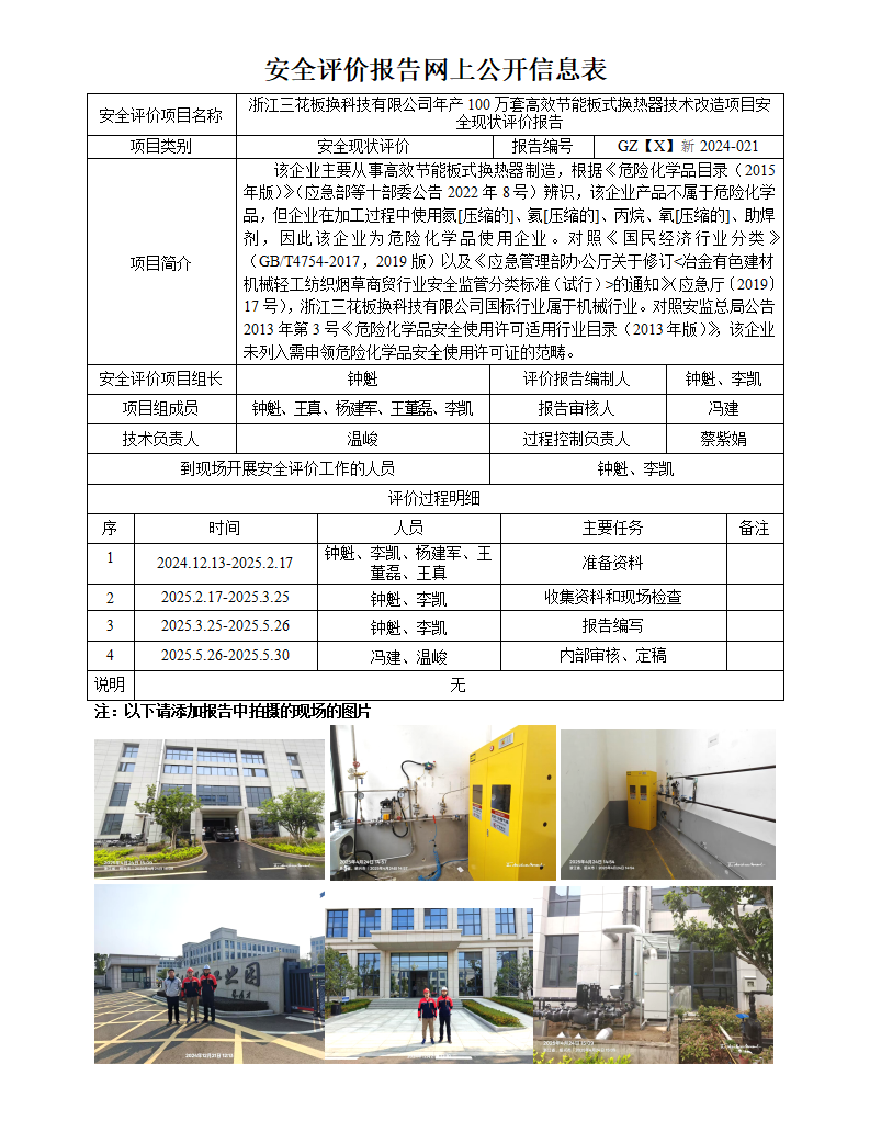 GZ【X】新2024-021浙江三花板换科技有限公司年产100万套高效节能板式换热器技术改造项目安全现状评价网上信息公开表