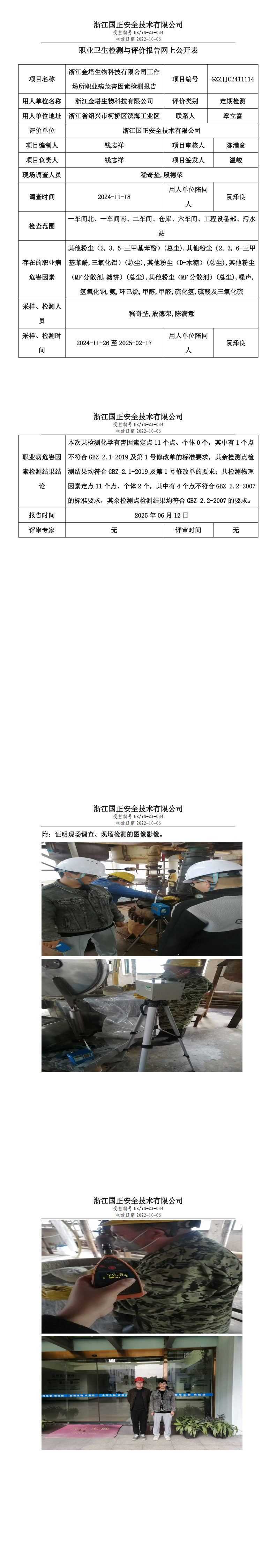 GZZJJC2411114浙江金塔生物科技有限公司工作场所职业病危害因素检测报告网上公开信息表