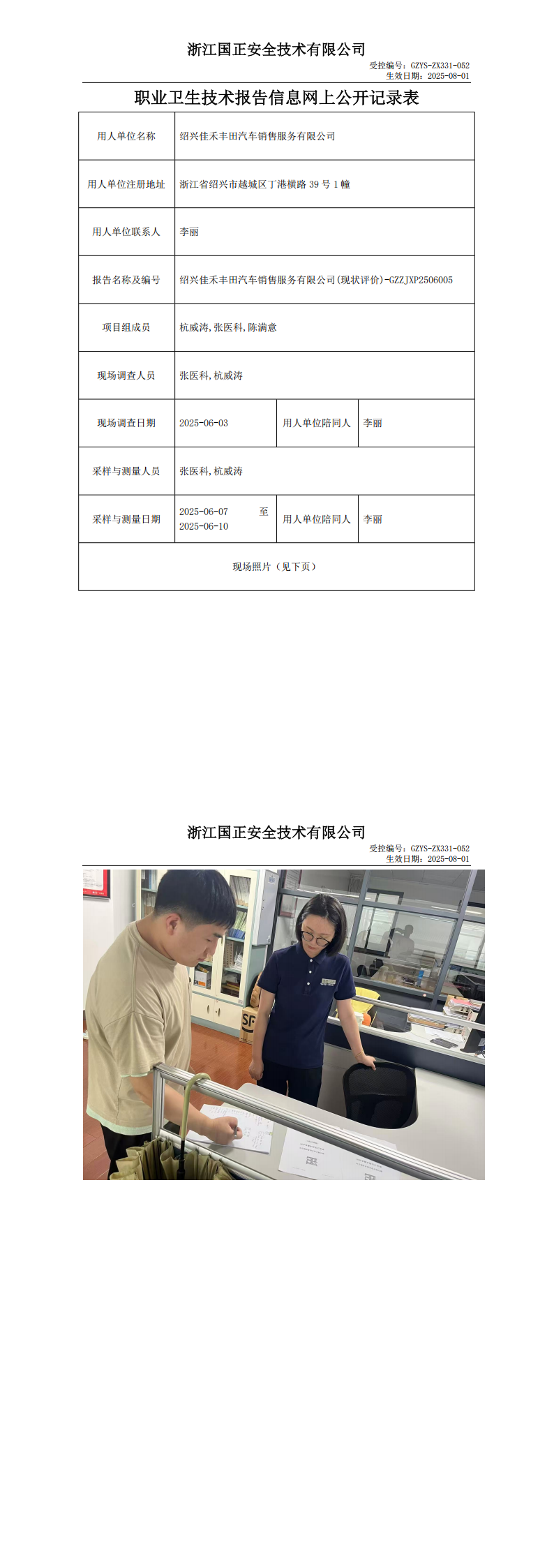 绍兴佳禾丰田汽车销售服务有限公司(现状评价)-GZZJXP2506005职业卫生检测与评价报告网上公开表