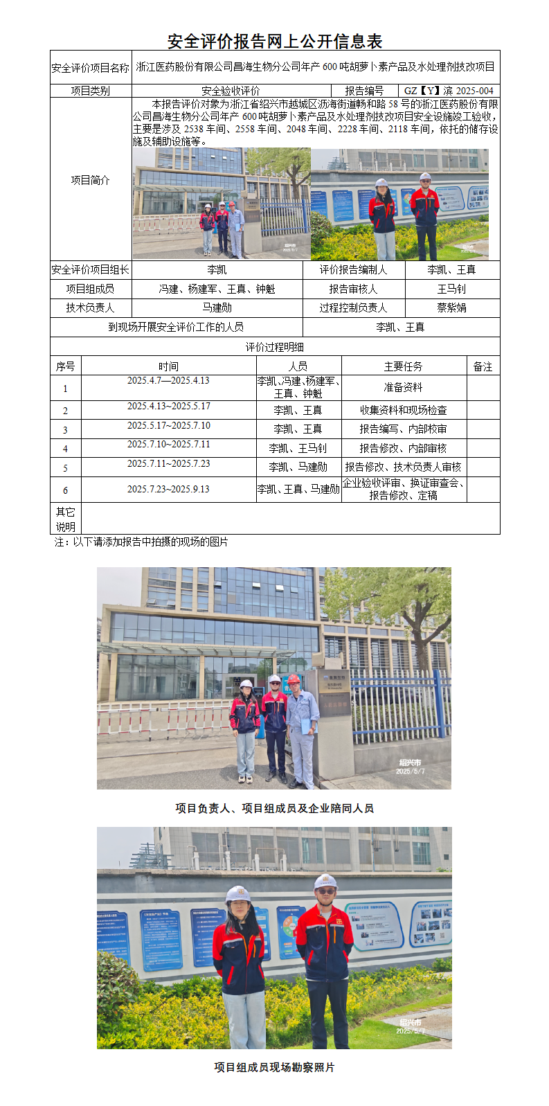 GZ【Y】滨2025-004浙江医药股份有限公司昌海生物分公司年产600吨胡萝卜素产品及水处理剂技改项目安全设施竣工验收评价 网上公开表