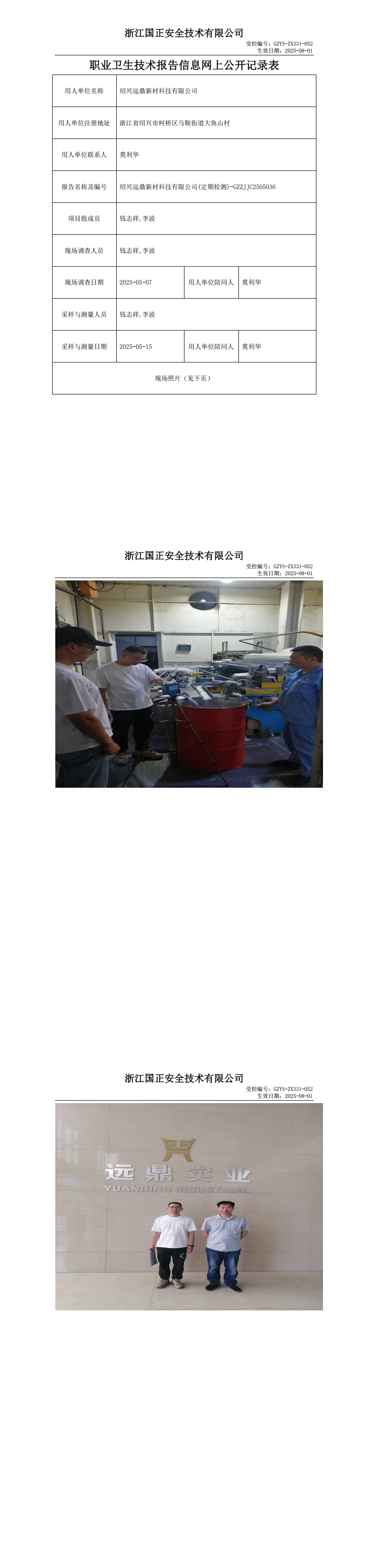 GZZJJC2505036绍兴远鼎新材科技有限公司工作场所职业病危害因素检测报告网上公开信息表