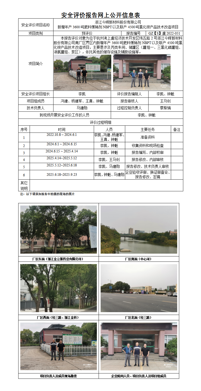 GZ【S】虞2022-51浙江今晖新材料股份有限公司新增年产3600吨肥料缓稀剂BPT以及联产4500吨氯化铵产品技术改造项目安全评价报告 网上公开表