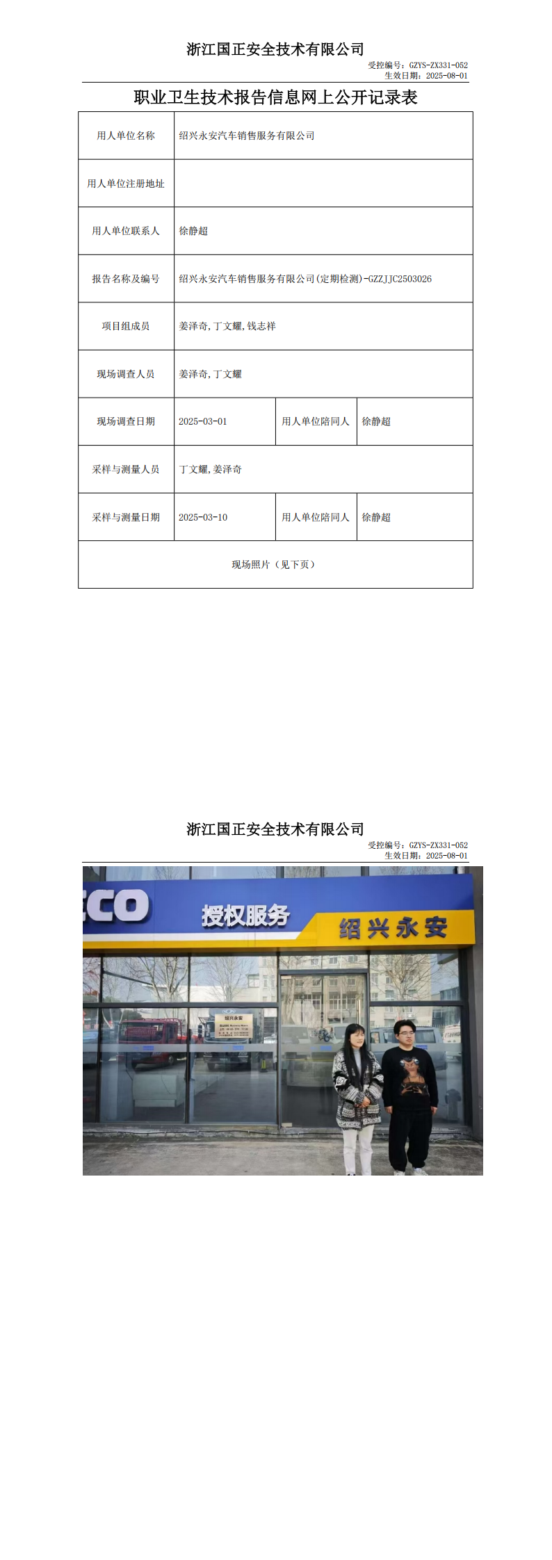 GZZJJC2503026_绍兴永安汽车销售服务有限公司职业卫生检测与评价报告网上公开表