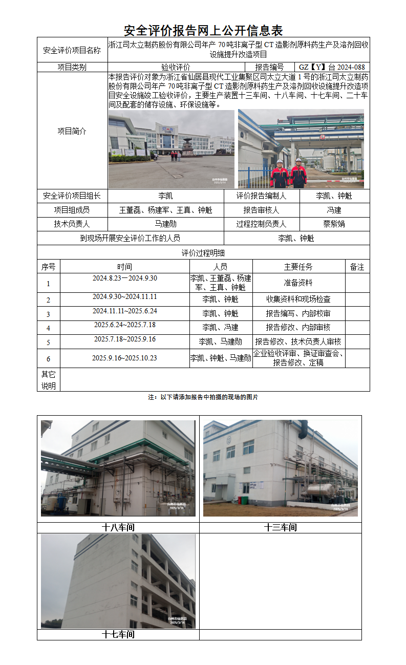 GZ【Y】台2024-088浙江司太立制药股份有限公司年产70吨非离子型CT造影剂原料药生产及溶剂回收设施提升改造项目安全设施竣工验收评价报告 网上公开表(1)